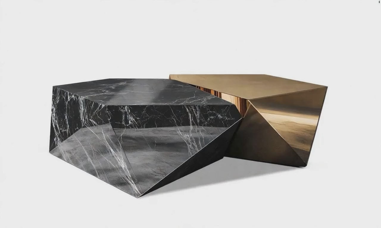 Our coffee table is a stunning representation of modern luxury and design innovation. It features a unique geometric structure combining two striking materials: black marble and polished brass. The black marble section is adorned with delicate white veining, adding a touch of natural elegance. The polished brass section contrasts beautifully with the marble, offering a sleek, reflective surface. The table's clean lines and angular, faceted appearance make it a captivating centerpiece in any contemporary living space.